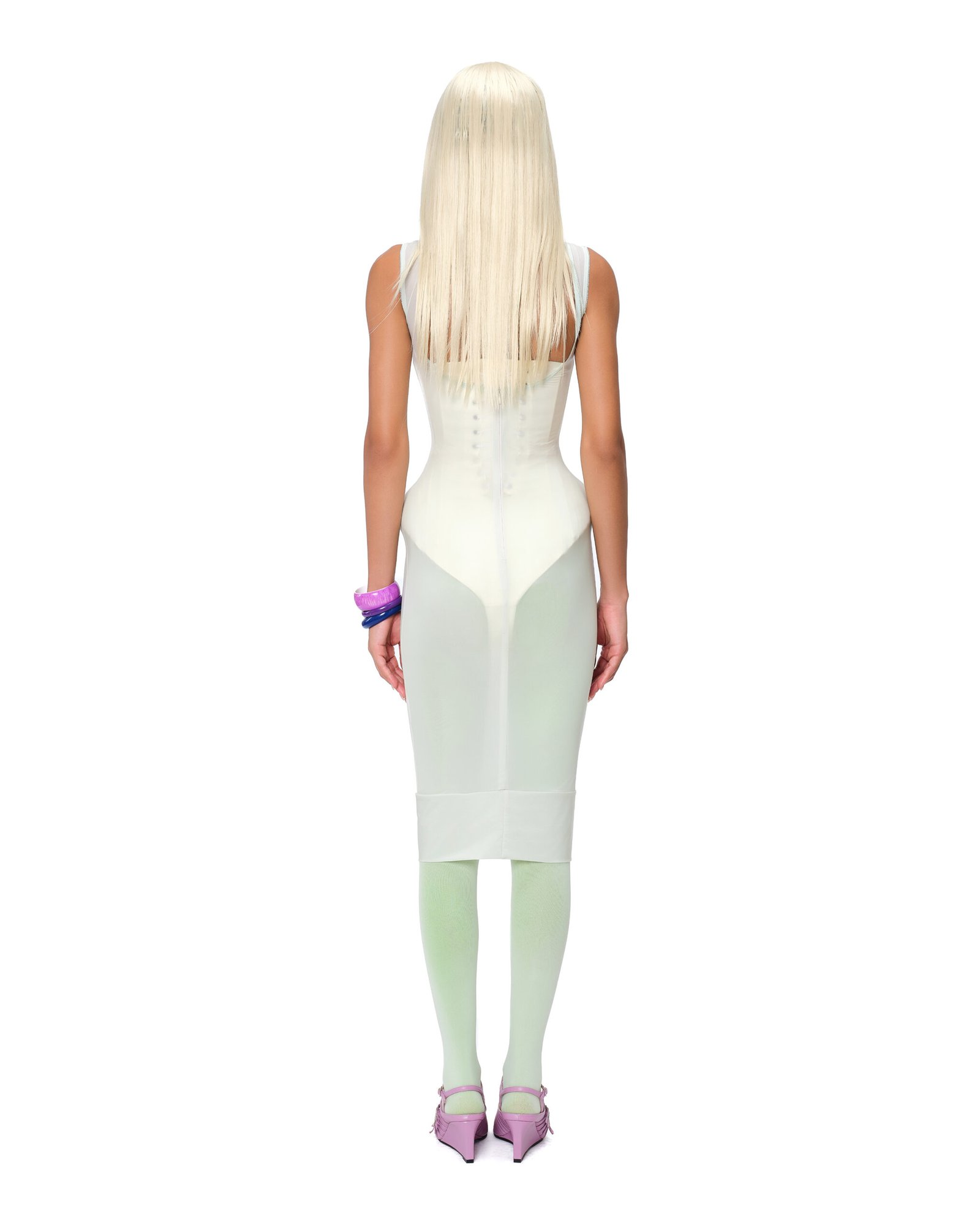 Pastel Pharaoh Corset Bodysuit – In pastel yellow with a cream-colored bust cup, featuring sharp lines and a modern, body-enhancing silhouette. The lace-up detail allows for adjustable fit, emphasizing the signature corset structure. Lace accents at the waist are thoughtfully placed, adding depth and softness to the overall look. A design that is both sensual and contemporary, balancing modern fashion sensibilities with classic elegance.
