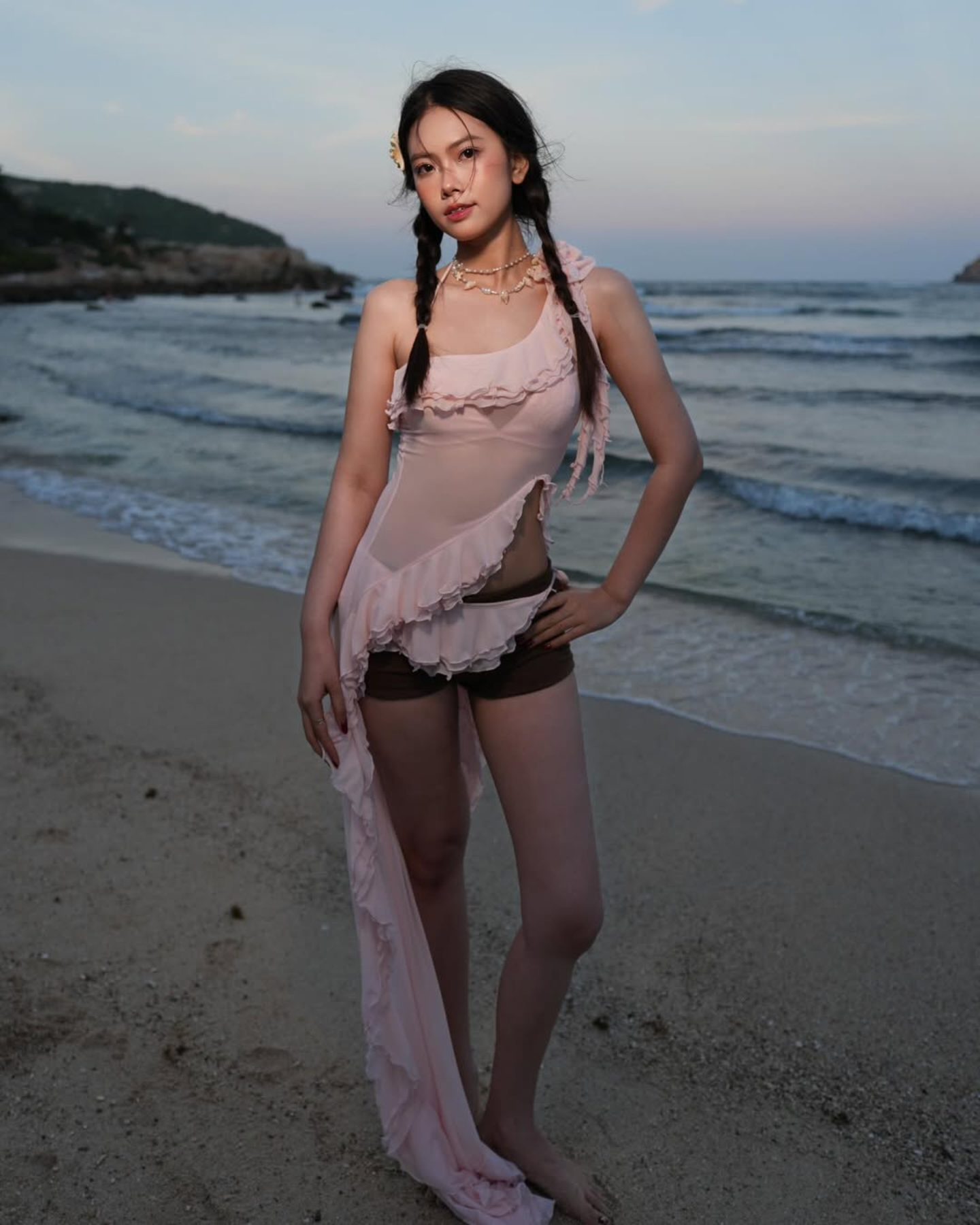 Model wearing Pirouette Set – a feminine beach outfit with ruffle top and cotton shorts