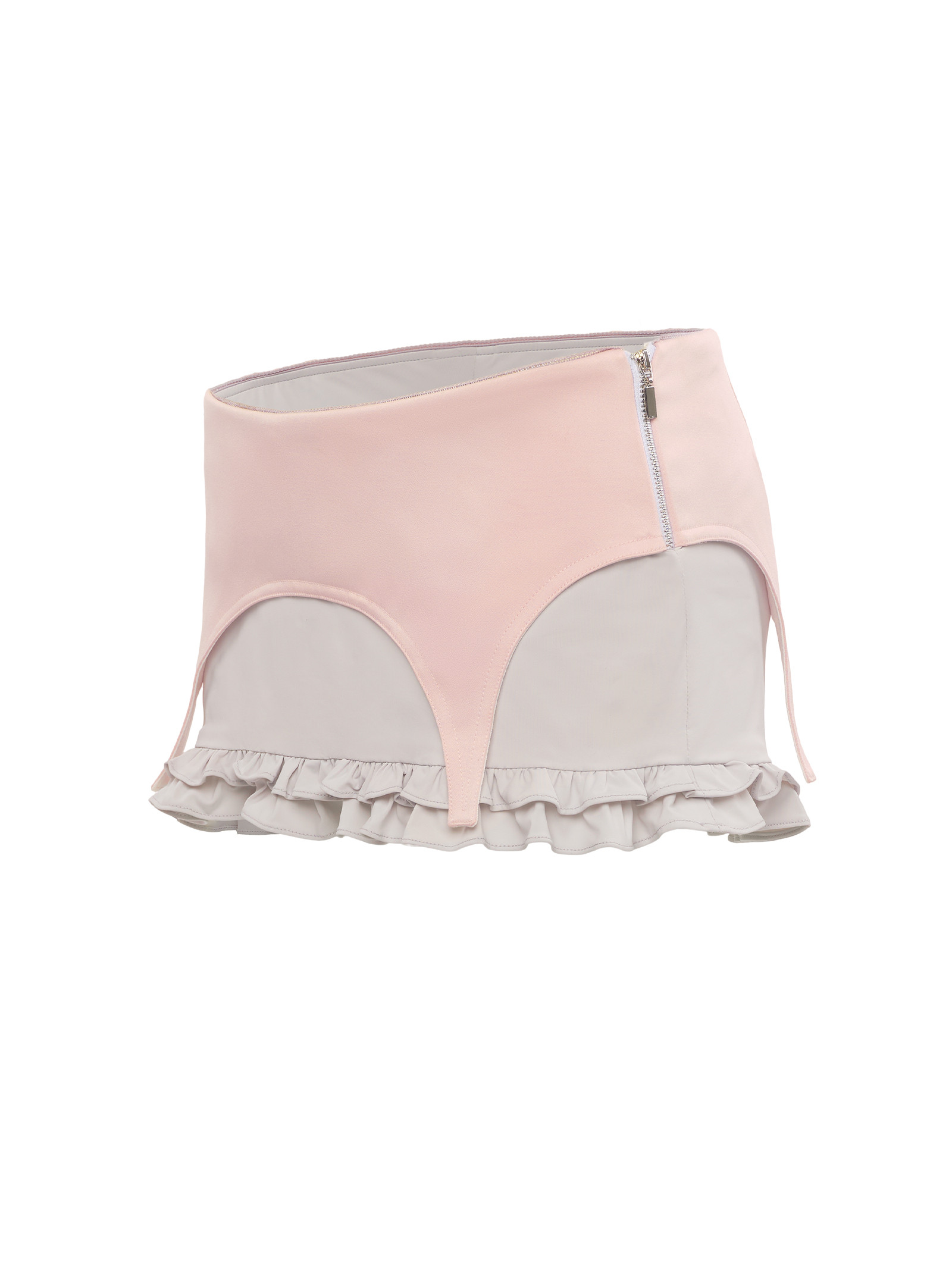 “Taffeta CORSET Bottom – Pastel pink: This is an edgy micro-mini skirt design. The skirt uses pastel pink taffeta, paired with a double lining of gray cooling stretch-jersey , providing a cool and easy-to-wear feel. The romantic accent lies at the hem, featuring ruffle detailing and exquisite lace trim, creating perfect harmony with the outfit’s classic spirit.”