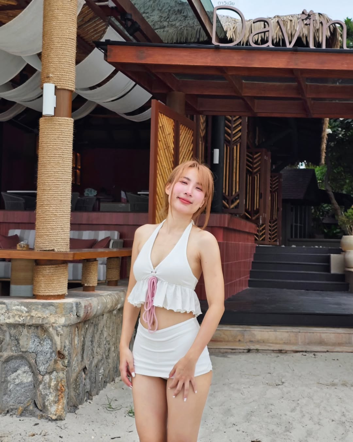 Model wearing a white cotton beach outfit with tie-front crop top and fitted shorts, styled with pink leg warmers and sandals.