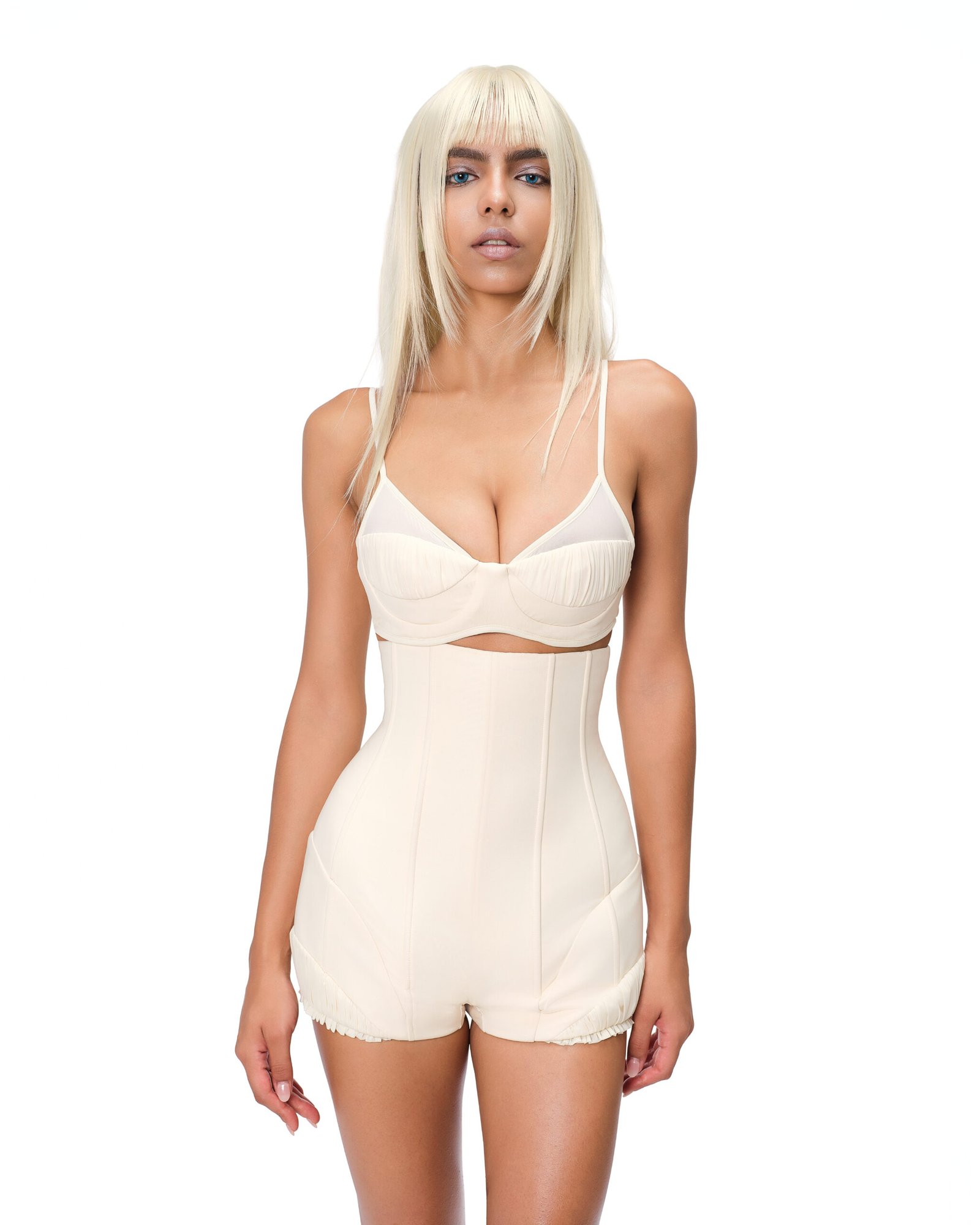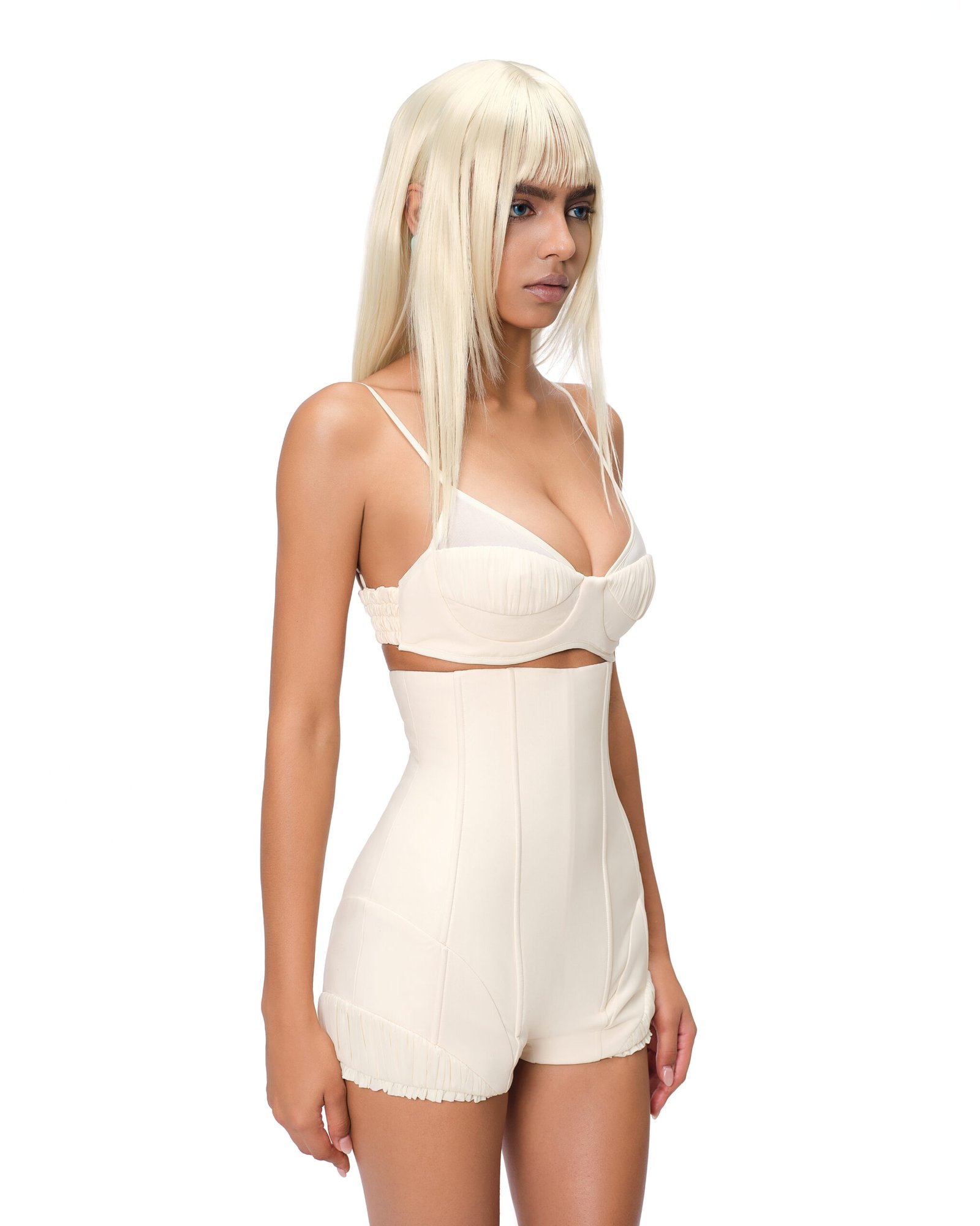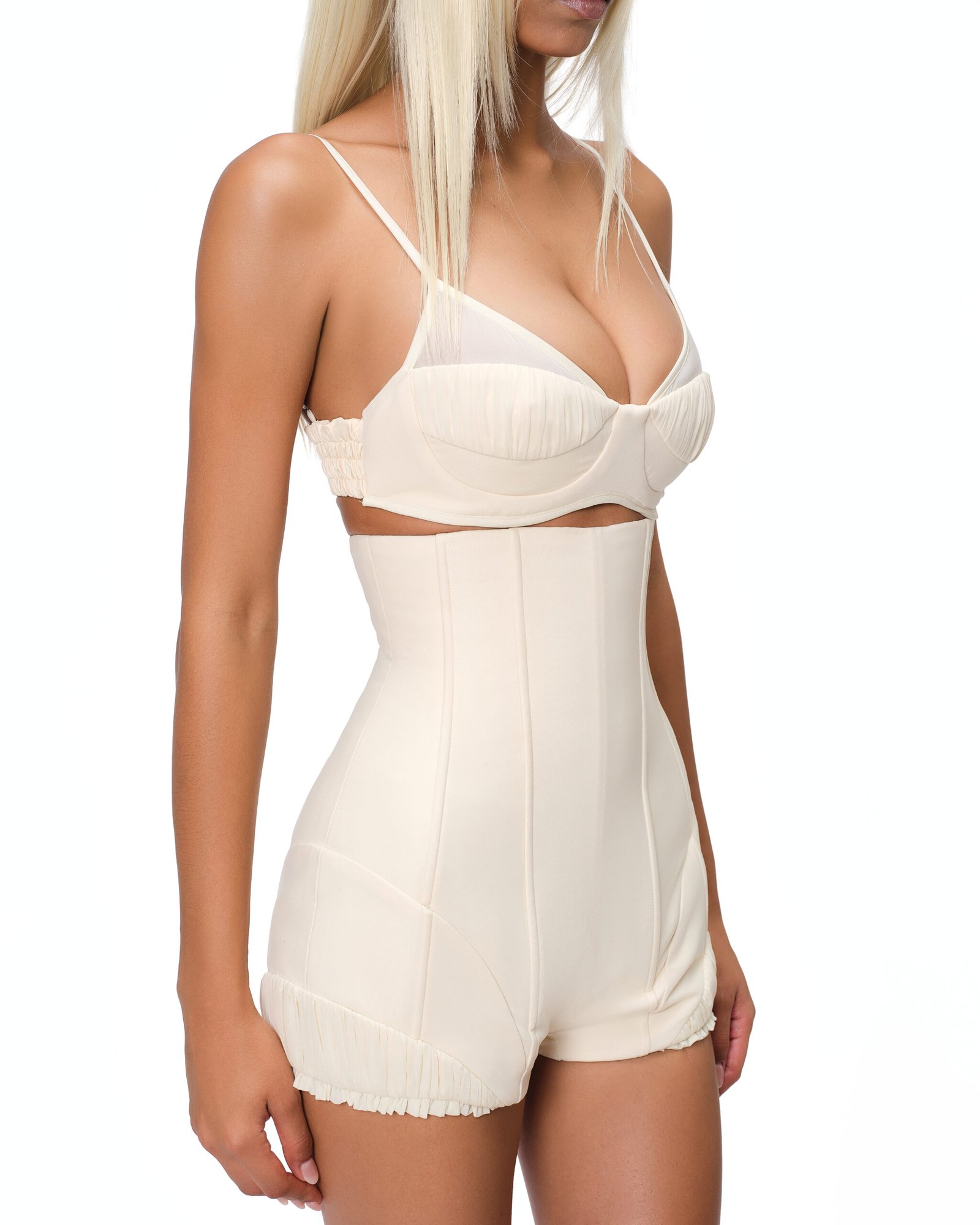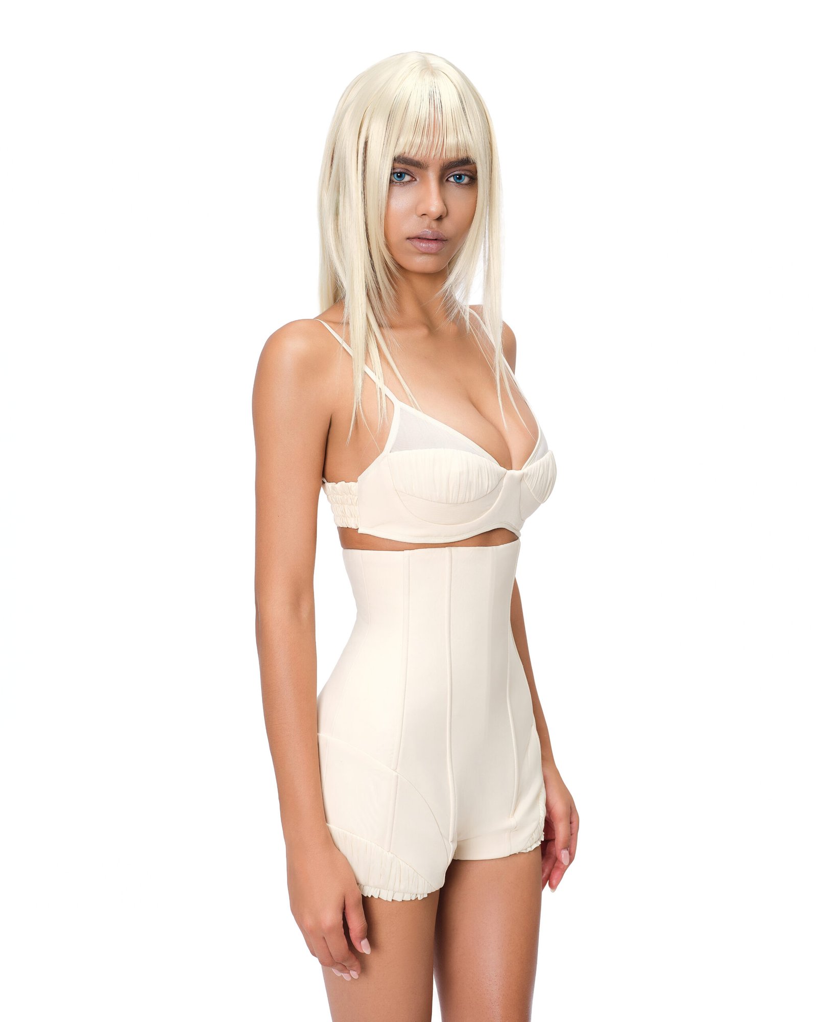 Kadas Bodysuit – In nude cream, featuring a bra with gathered sheer fabric that creates a subtle visual focal point. The hip padding is proportionally tailored to enhance soft curves, emphasizing the bust and waist. A modern, minimalist design with a structured silhouette, balancing technical craftsmanship and femininity.