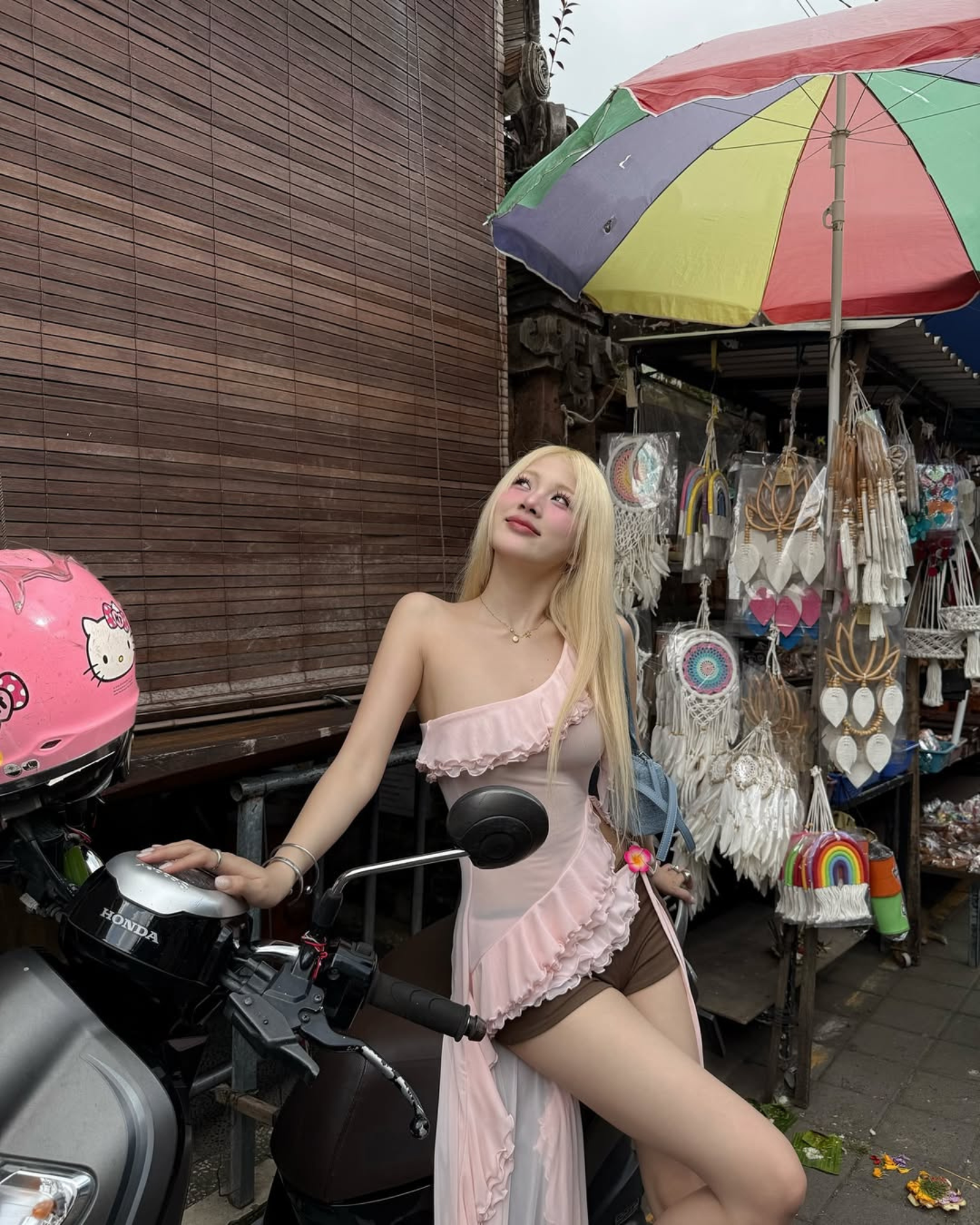 Model wearing Pirouette Set – a feminine beach outfit with ruffle top and cotton shorts